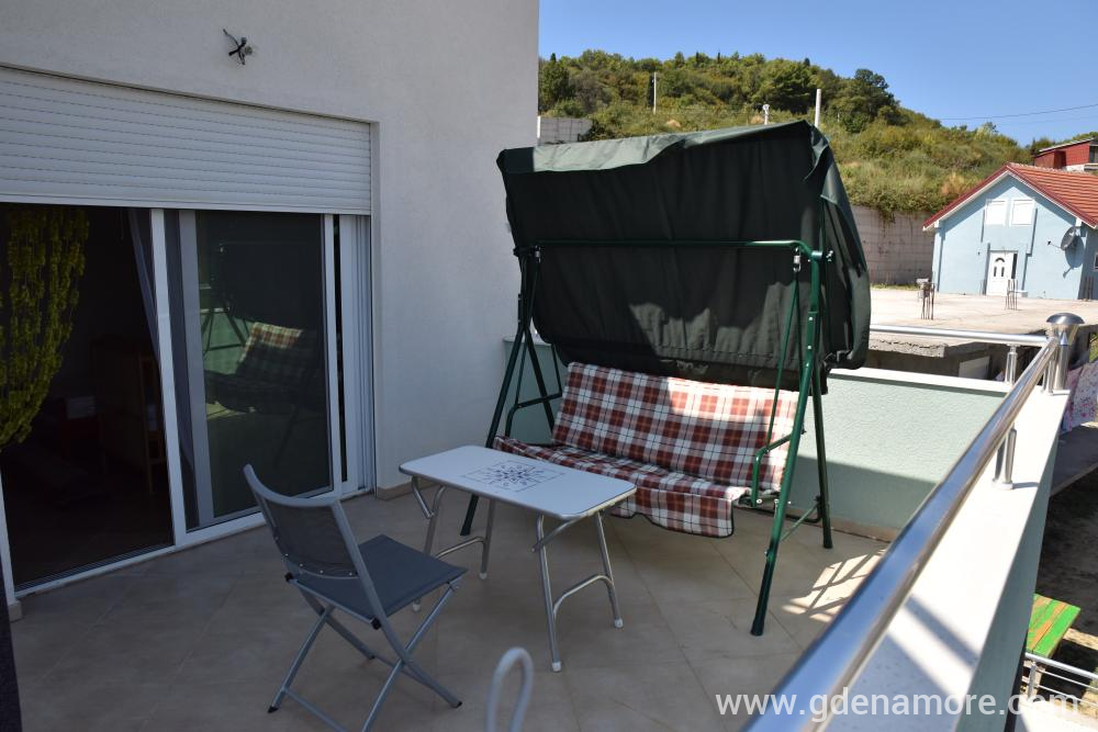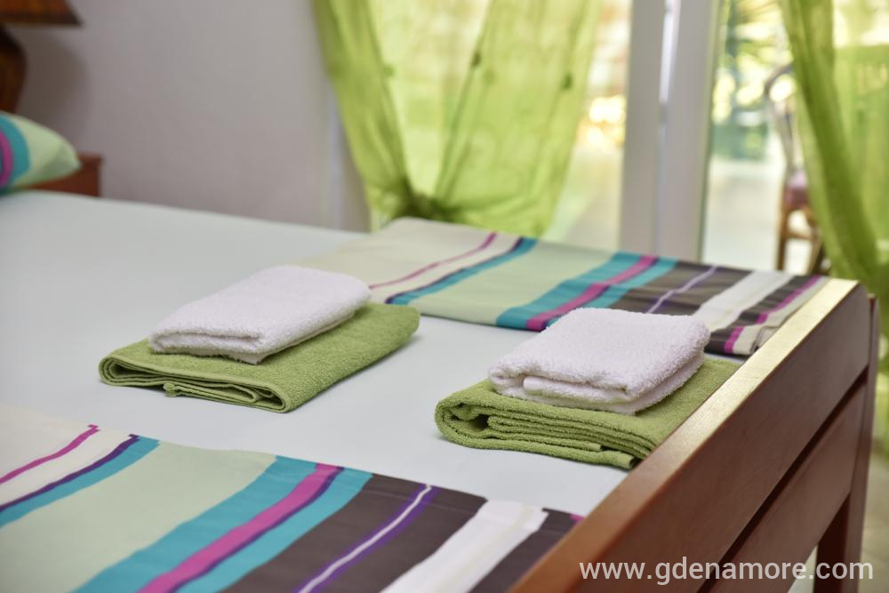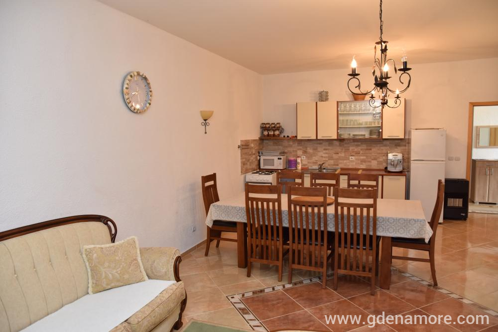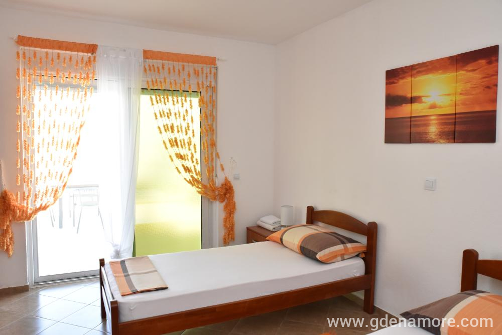 Det nybygde huset ligger på en høyde med vakker havutsikt; 800 meter fra den store stranden; med parkering; hvert rom har sin egen terrasse med bord og stoler; klima; første etasje har felles stue med TV og kjøkken, hvor det er 4 leiligheter, som har eget bad og toalett; i andre etasje er det en leilighet med tre soverom, felles kjøkken og bad, som er praktisk for større familier; i hvert rom er det mulig å legge til en køyeseng eller barnesenger; bade- eller strandhåndklær og sengetøy er inkludert i prisen; mulighet for å bruke grill; Internett / WIFI; i et miljø på 400 meter kan du finne supermarkeder, bakerier og restauranter;